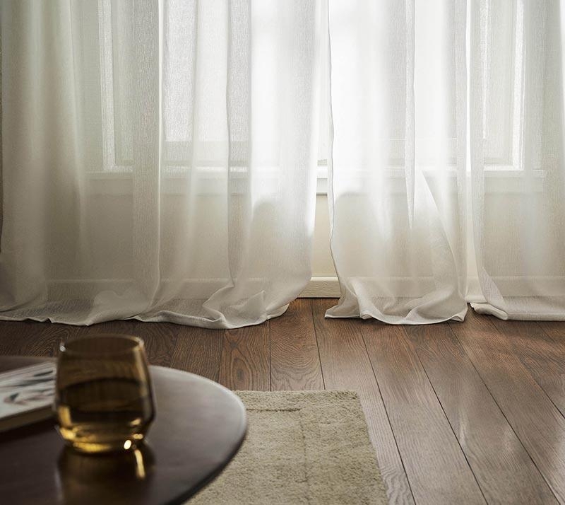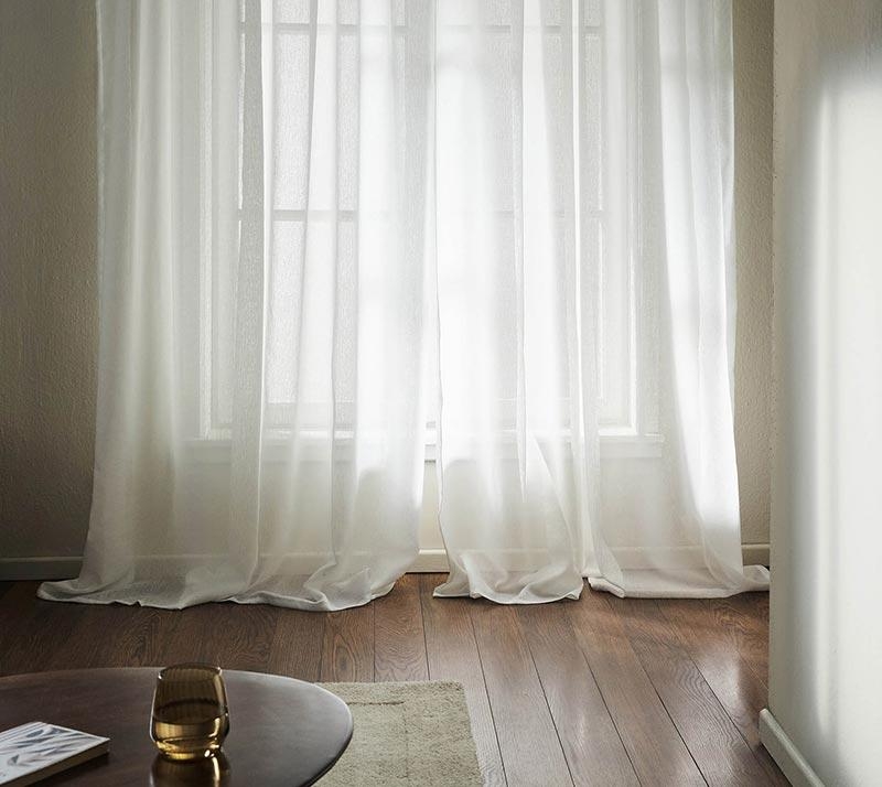 Κουρτίνα μέτριας σκίασης από μονόχρωμη διάφανη γάζα με minimal σταυρωτή πλέξη. Ραμμένη με ματ ασημί τρουκς.